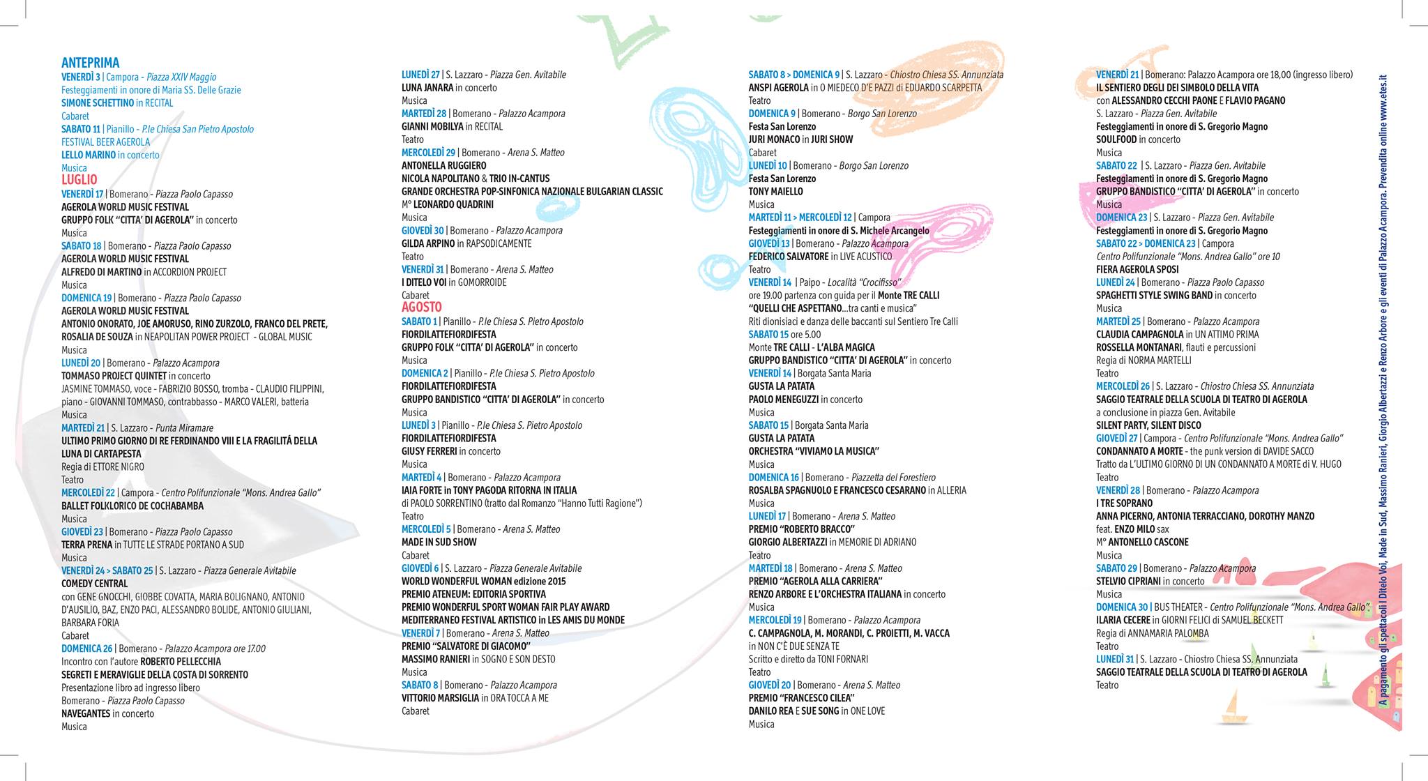 FESTIVAL AGEROLA SUI SENTIERI DEGLI DEI 2015 Ingrandisci immagine FESTIVAL AGEROLA SUI SENTIERI DEGLI DEI 2015Tantissimi appuntamenti con grandi ospiti e tante proposte per la musica, il teatro, la letteratura in programma dal 13 luglio al 31 agosto 2015. Ingresso libero, fino ad esaurimento posti a sedere. iloveagerola2024-04-09T14:35:42+02:00