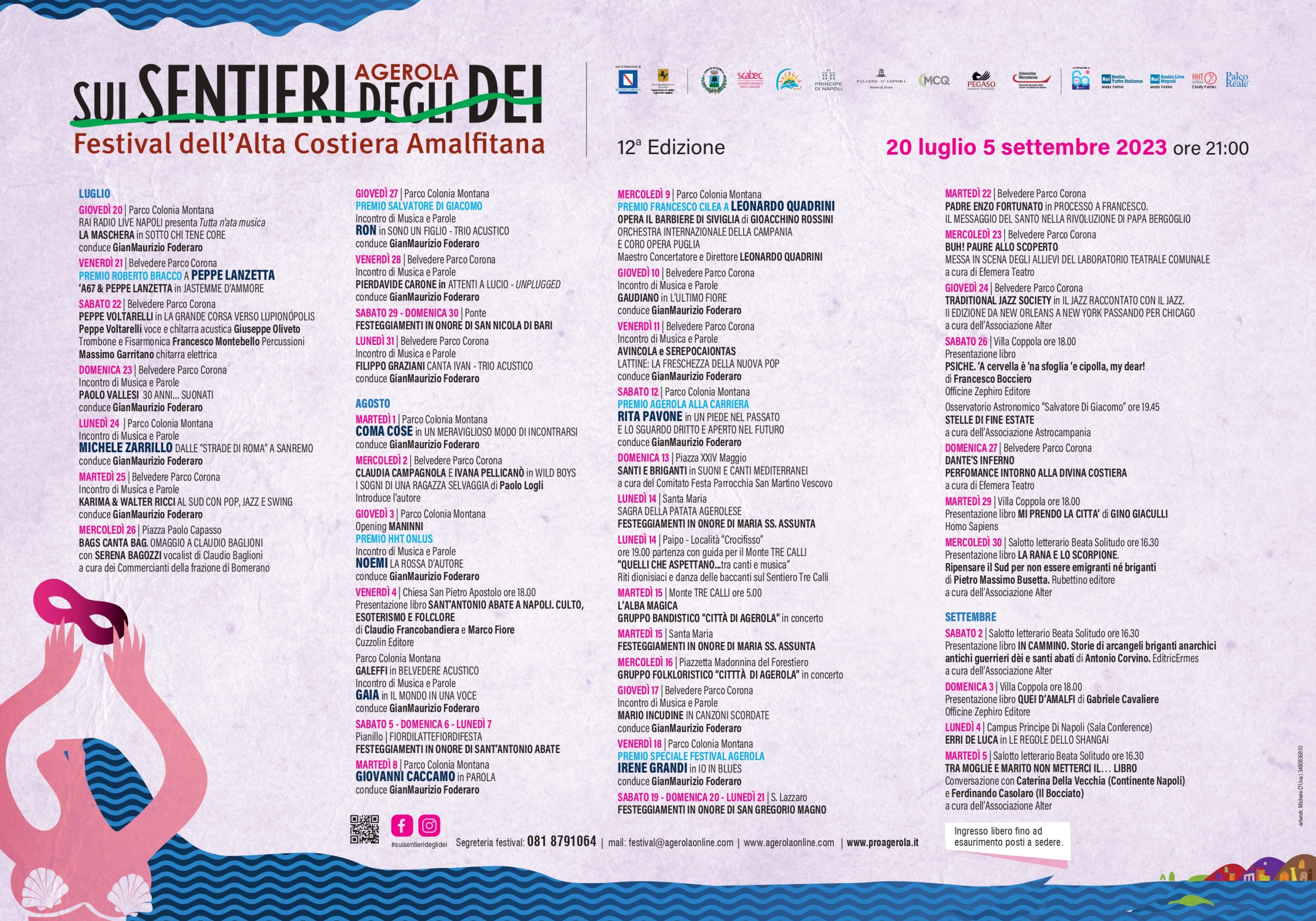 FESTIVAL AGEROLA SUI SENTIERI DEGLI DEI 2023 Ingrandisci immagine FESTIVAL AGEROLA SUI SENTIERI DEGLI DEI 2023Quarantadue appuntamenti con grandi ospiti e tante proposte per la musica, il teatro, la letteratura in programma dal 20 luglio al 5 settembre 2023. Ingresso libero, fino ad esaurimento posti a sedere. iloveagerola2024-04-09T14:34:33+02:00