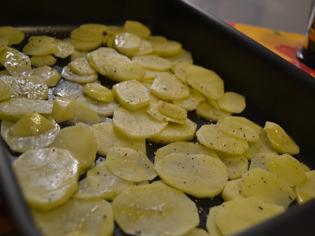 Sbollentare per un paio di minuti le cipolle, asciugarle tra due canovacci e farle dorare in una padella con olio d’oliva. Coprire con uno strato di cipolla e l’olio di cottura le patate disposte precedentemente nella pirofila.